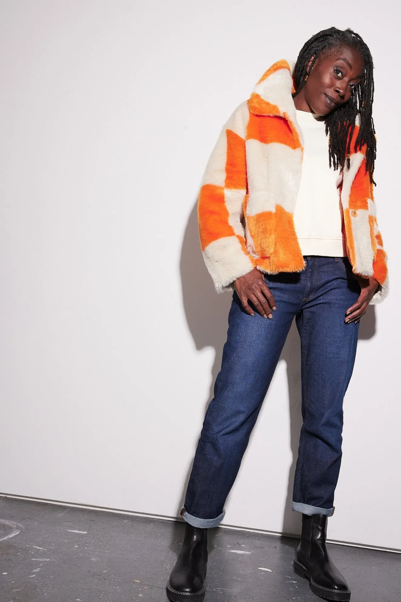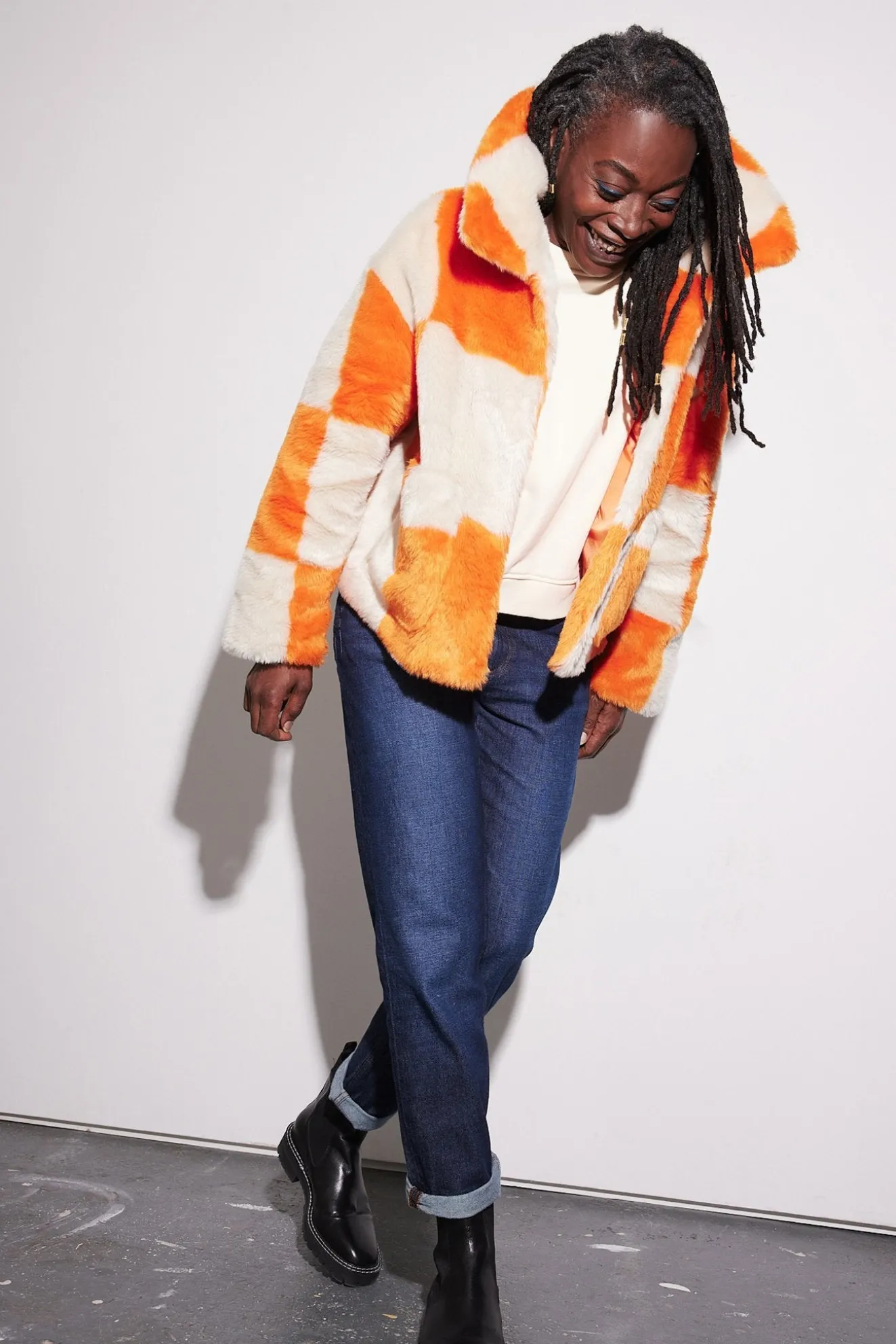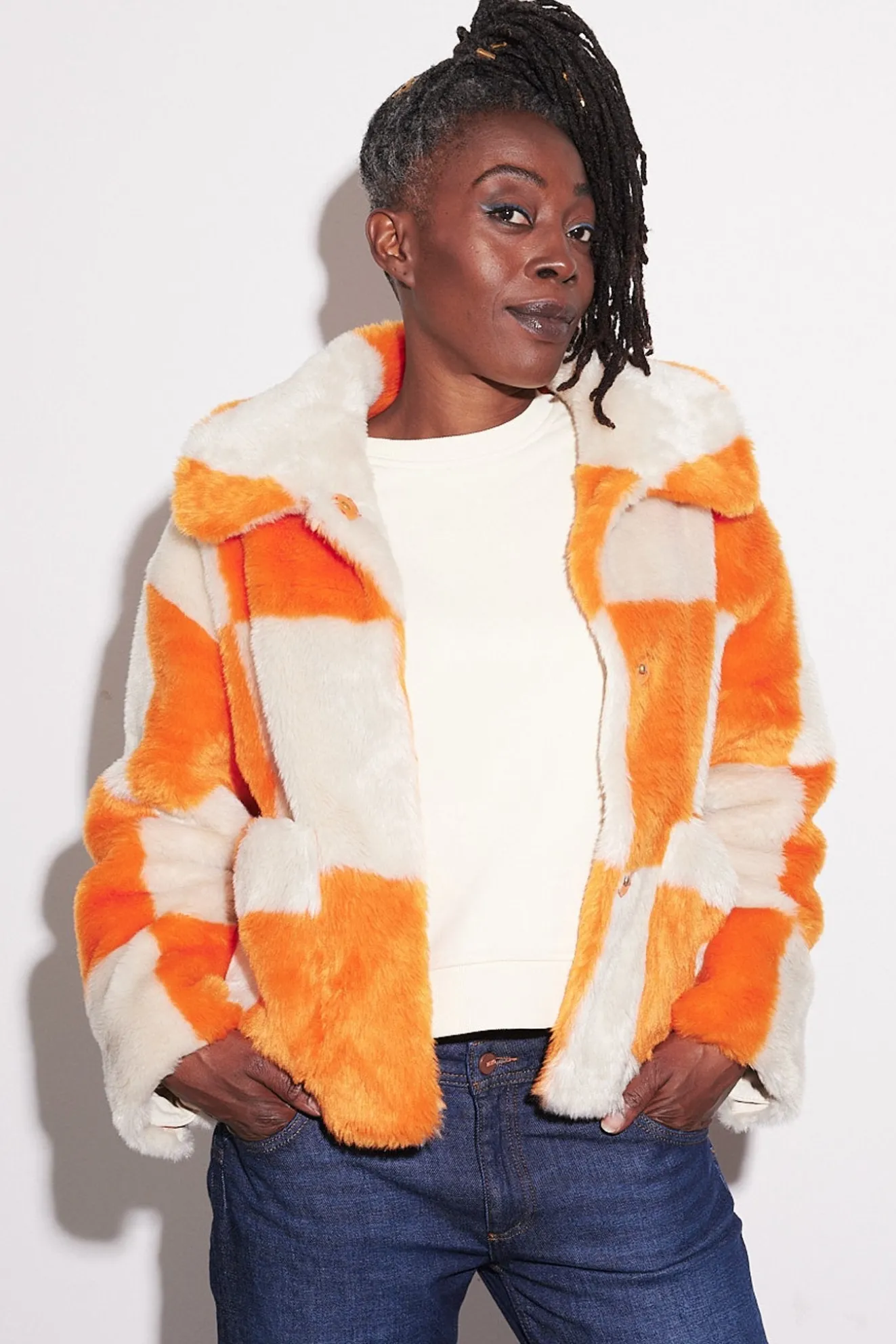 A True Statement Piece That Will See You Through Many Winters To Come, The Traci Faux Fur Coat Is A Girls Best Friend. The Boxy Fit And Slouchy Sleeves Ooze Effortless Cool, Whilst The Bright Orange Checkerboard Print Will Elevate Even The Simplest Of Outfits. Made From A Super-Soft Faux Fur With A Recycled Polyester Lining, Meaning You Can Wear This Gorgeous Coat With A Clear Conscience Knowing That No Animal Has Suffered. Finished Off Beautifully With A Removable Stitched In Logo Patch To The Right Sleeve And Openings At The Cuffs So That You Can Easily Roll Them Up