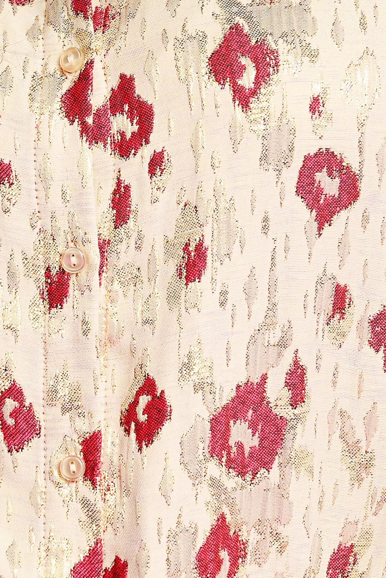 Shine Like A Star In The Dazzling Leopard Shimmer Blouse From Pom Amsterdam. Made From A Jacquard Fabric With A Gorgeous Gold Lurex Thread Detailing Across An Ecru Background, Perfect To Make The Burgundy Print Really Pop! Finished To Perfection With Popper Fastenings, Wide Sleeves And Stylish Smock Detailing To The Cuffs.