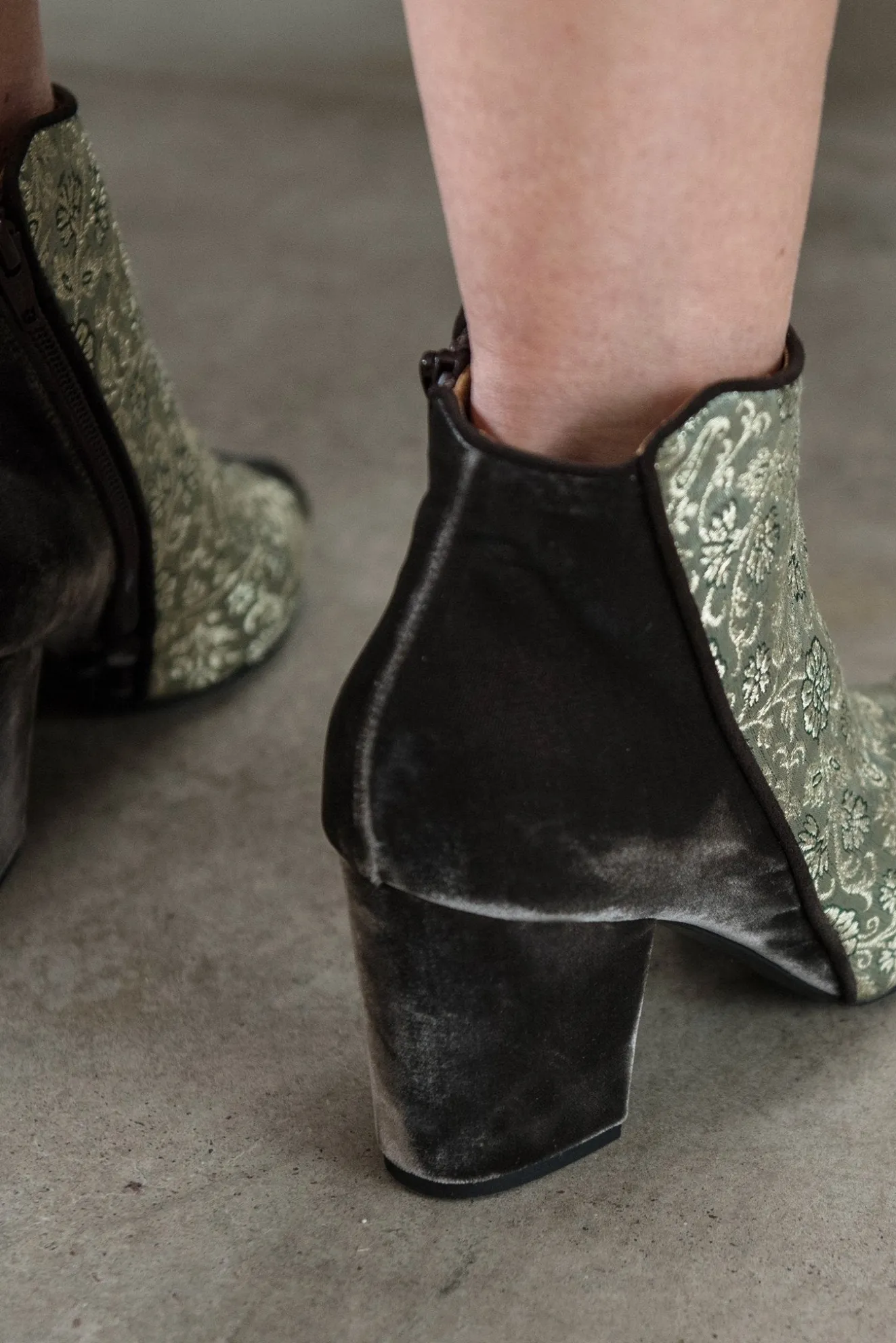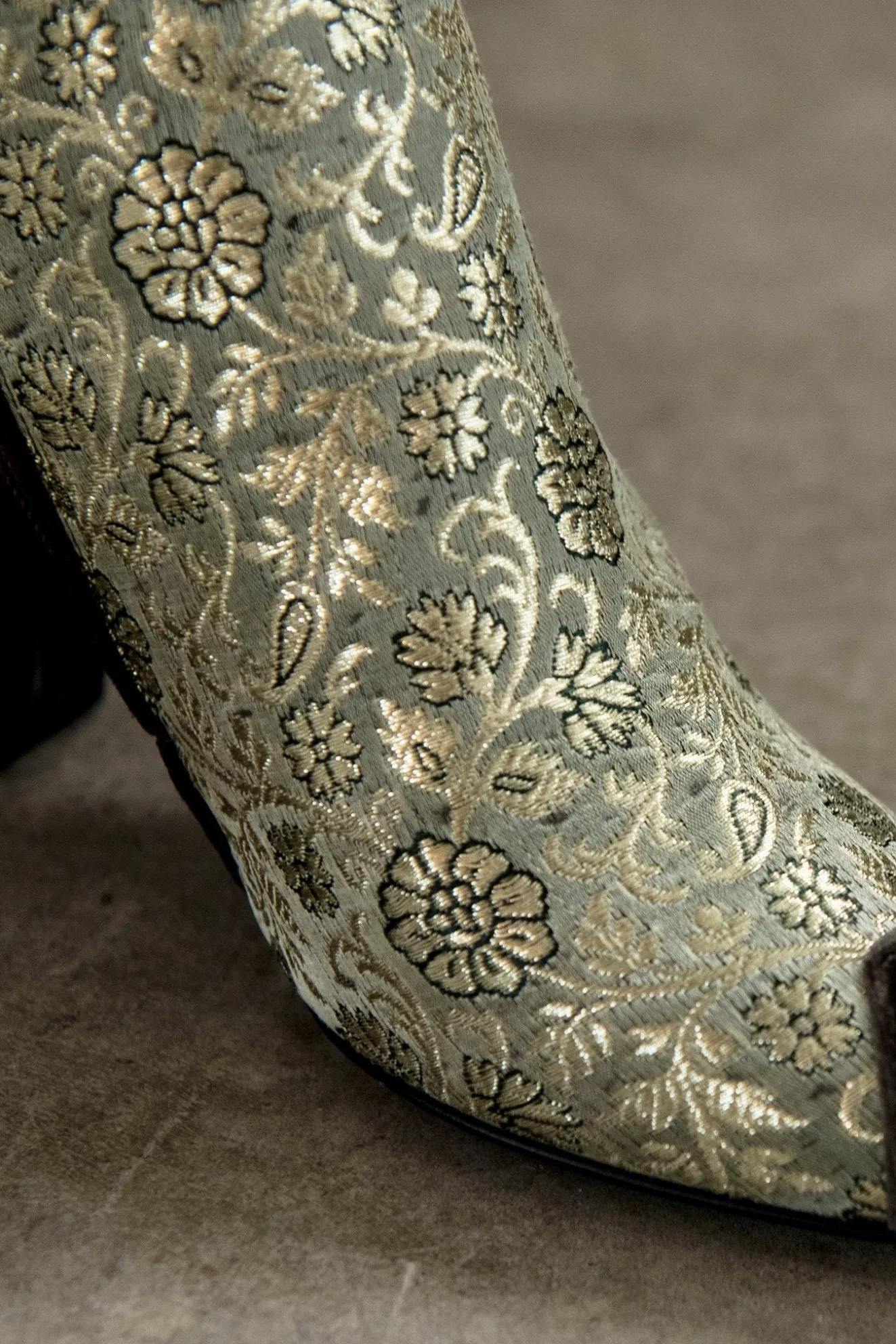 The Gold Rose Of Banaras Ankle Boot Is Hand Made In Italy With Luxury Italian Velvet And Beautiful Hand Woven Silk Brocade Fabric From The Ancient City Of Banaras, The Capital Of Silk Weaving In India Since The 17Th Century. With Features Inspired By Geometric Architecture Of The Ancient Persia, They Feature A Premium Italian Lining And Sole, Making Them As Soft And Comfortable As They Are Stunning. The Gorgeous Moss Green Velvet Toe Caps And Backs And Comfortable Chunky Midi- Heel Make These Boots As Versatile And Wearable As They Are Comfortable.