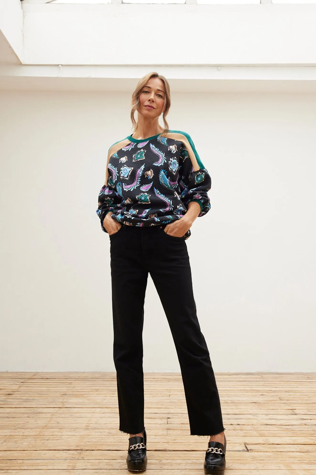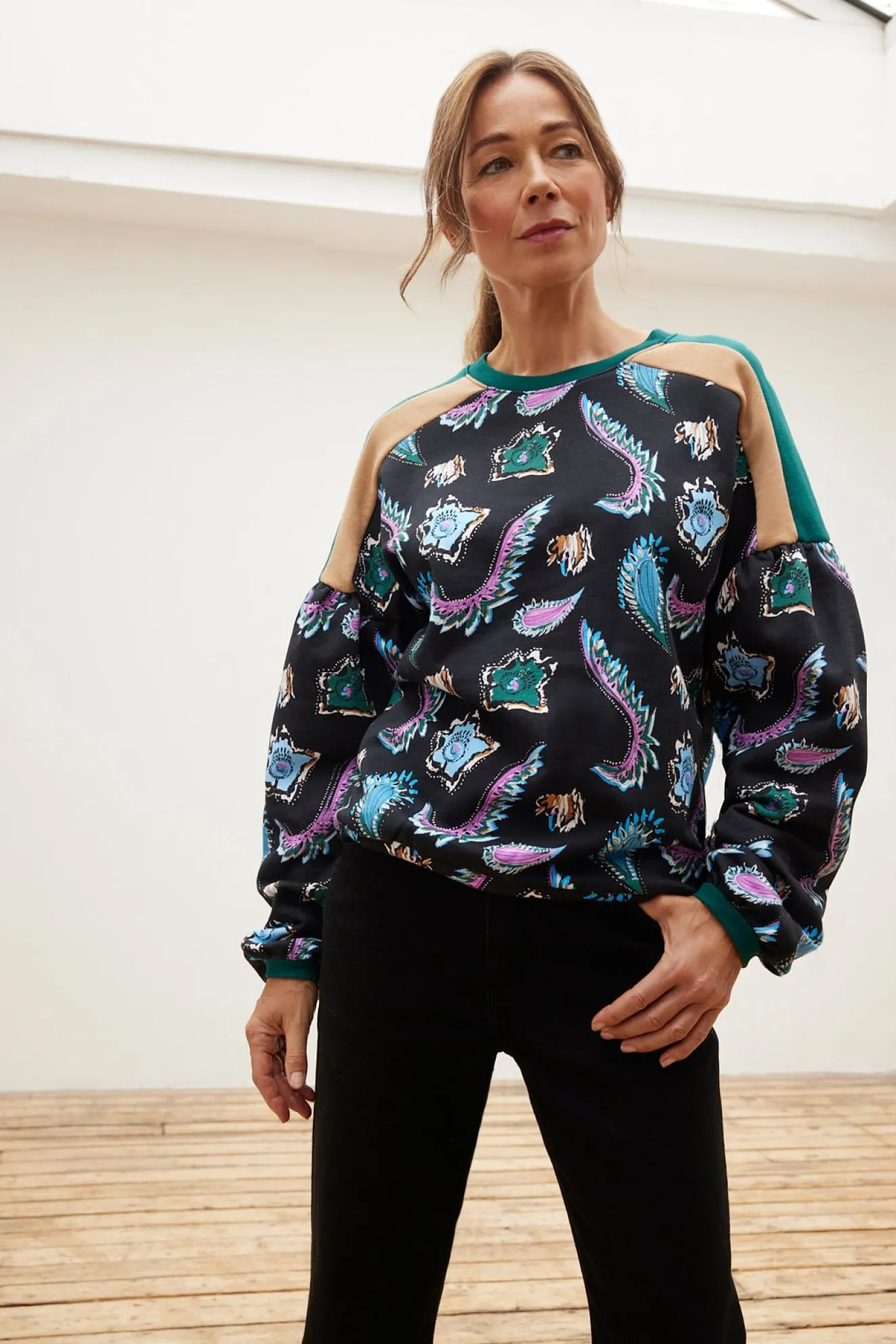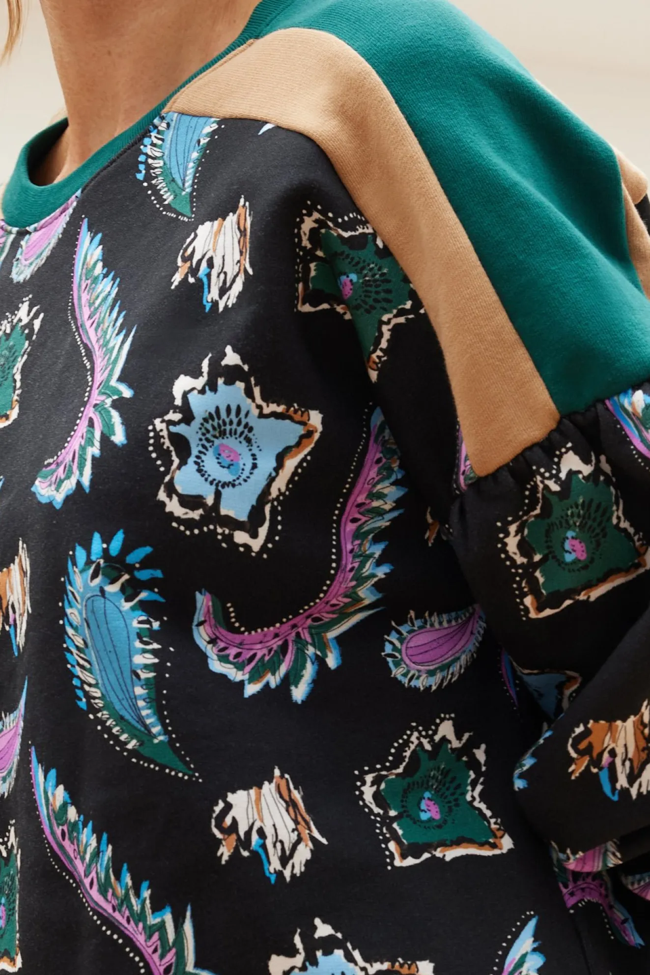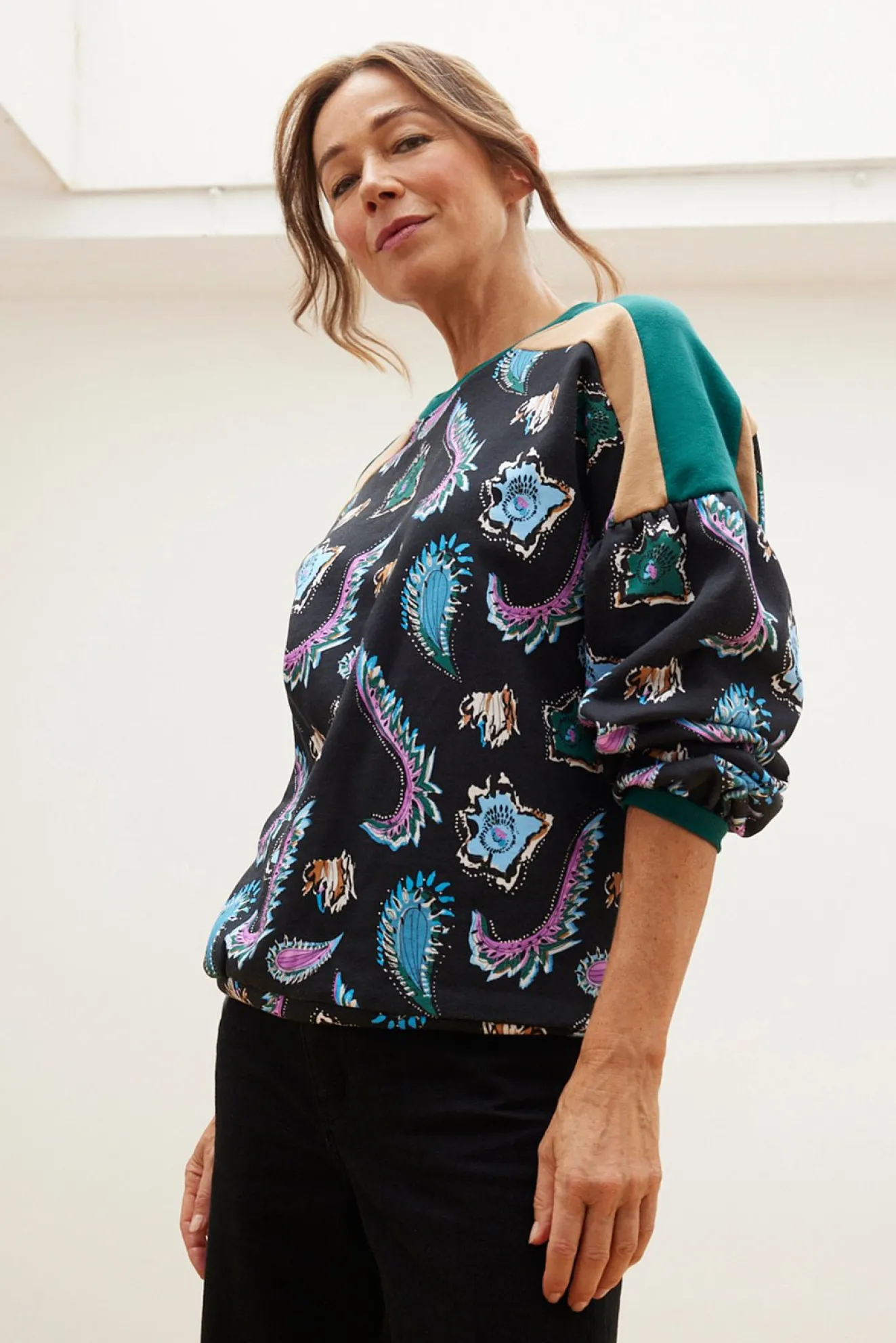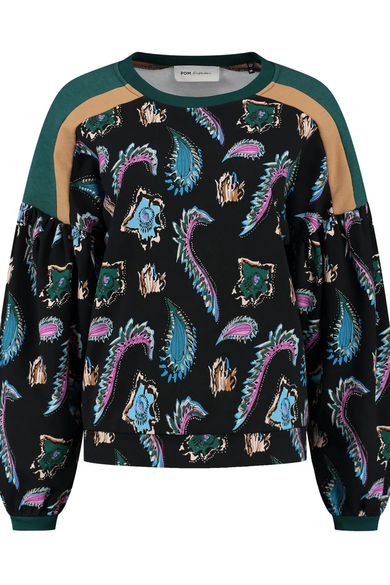 Nothing Screams Autumn Like Stylish Sweater And This One From Pom Amsterdam Will Lived Up Your Wardrobe Like No Other. The Wonderful Black Tides Print Has Splashes Of Green, Soft Blue And Purple To Create A Bold And Unique Paisley Pattern, With Statement Colour Blocking Along The Shoulders For Some Extra Edge.